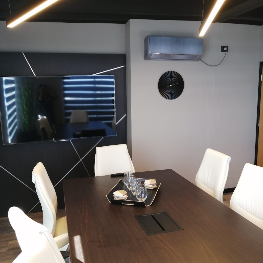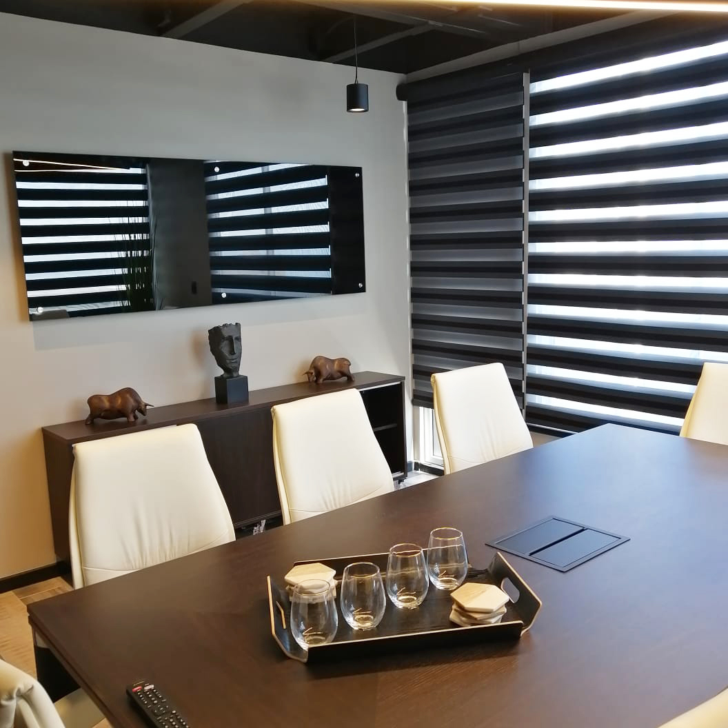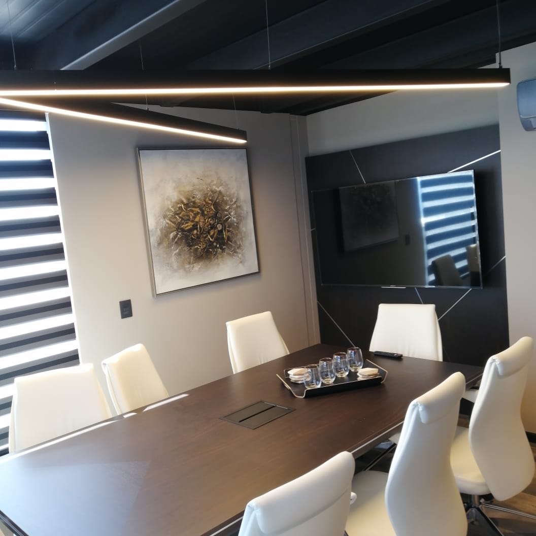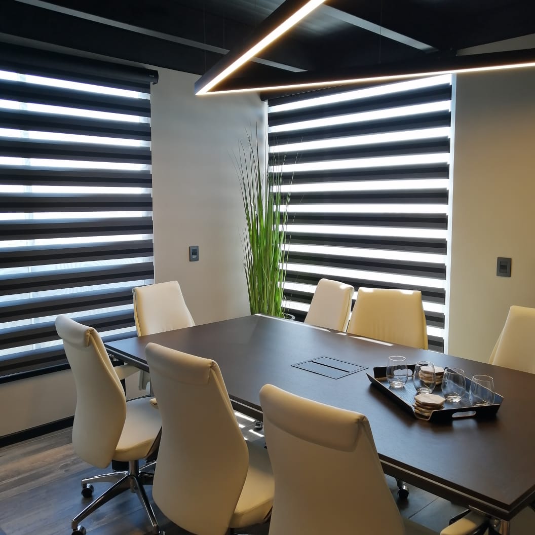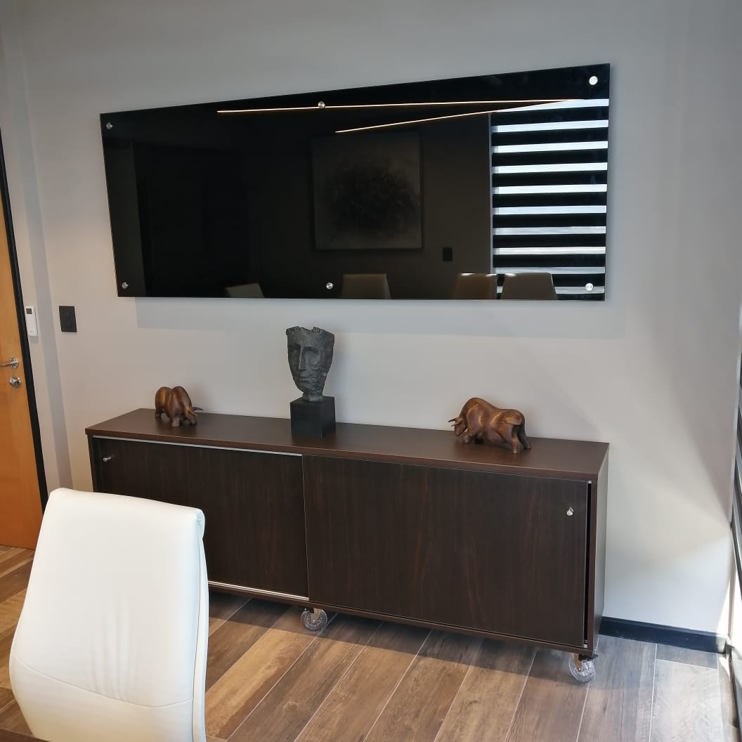 Las soluciones desarrolladas incluyeron gabinetes con mecanismos electrónicos, optimizando funcionalidad, seguridad y experiencia de uso. Se trabajó con estructura SILHOUETTE, cubiertas en chapa de madera color ébano, cubiertas Corian en recepción y vidrios biselados de espesor especial para gabinetes y mesa de reuniones, complementados con una selección de sillas ergonómicas. El proyecto contempló una asesoría integral en diseño, desde la conceptualización hasta la definición técnica, asegurando coherencia total entre arquitectura, función y estética final.
